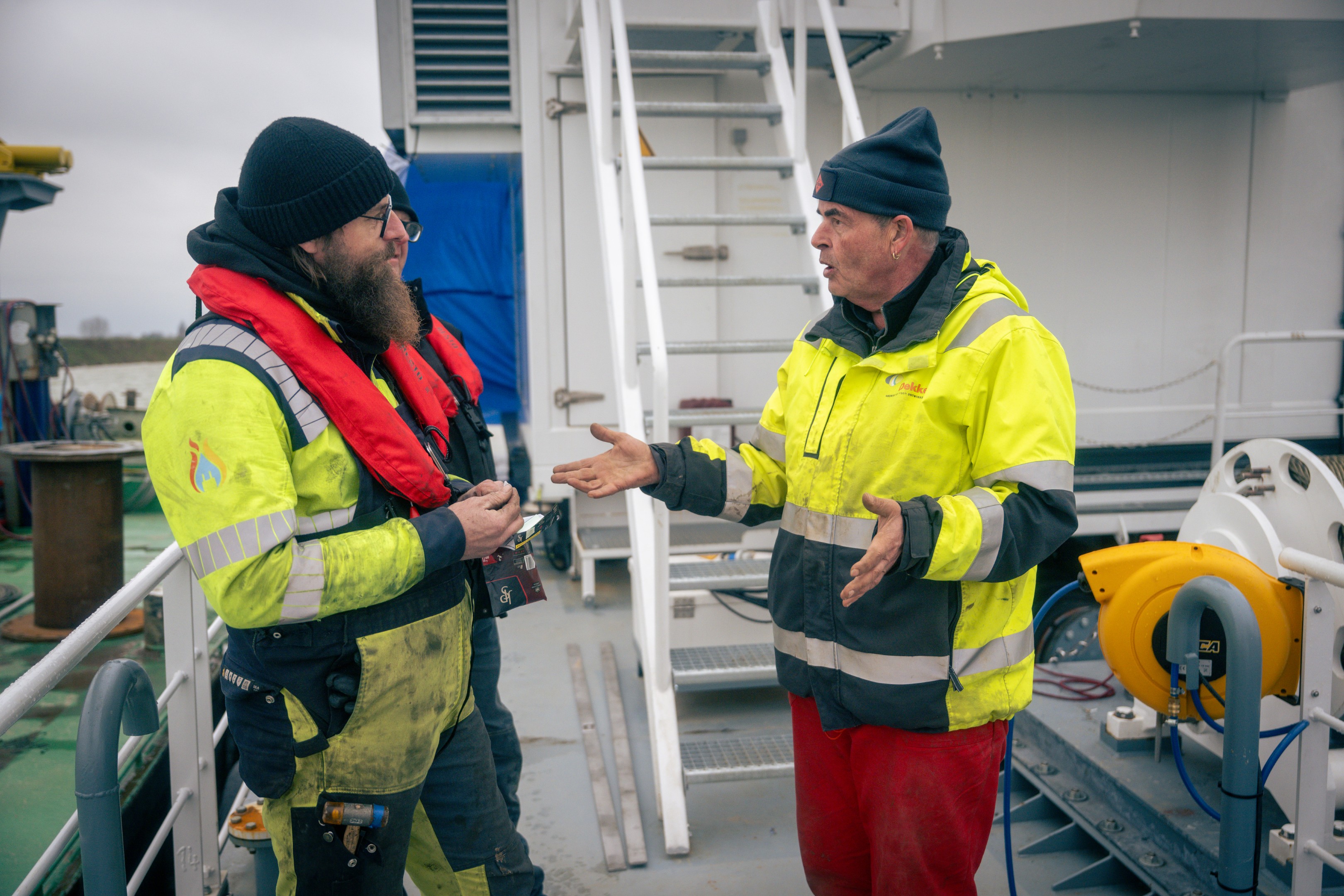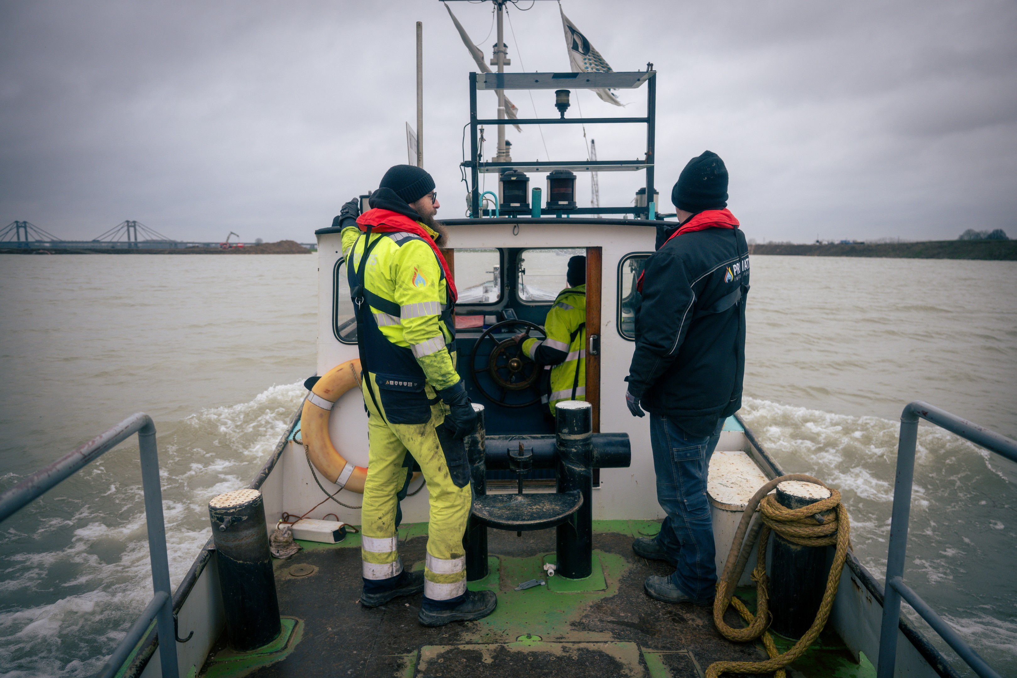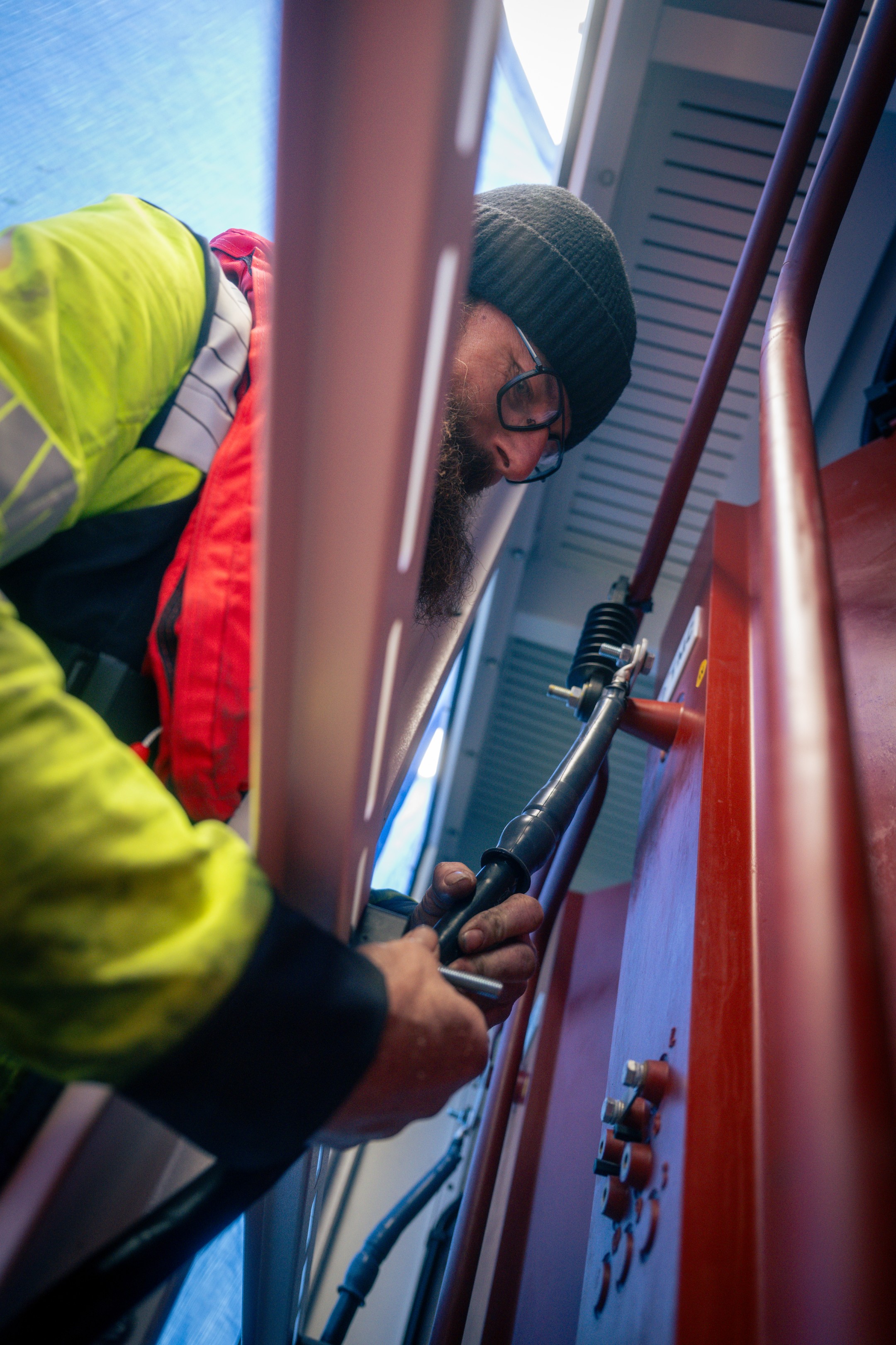 Tijdens de realisatie op de plas in de Willemspolder kregen monteurs Remco ten Hove en Huib Sonneveld te maken met de rauwe elementen. In een snijdende wind en met koude handen werd er gewerkt aan het aansluiten van de middenspanningskabels op de transformator aan boord. Met name het krimpen van de moffen onder deze weersomstandigheden vereiste puur vakmanschap om de kwaliteit en veiligheid van de 10 kV-verbinding te garanderen.